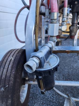 One thing about Coatings is there’s a lot of mixing that goes on and this machine does that mixing as you go, which saves a huge amount of time. It also can heat the product when it does the mixing. It can run two guns, It is big and heavy so it has an attachment at the top that you can use for a forklift or any other chain lift to get it up plus it is built on an aluminum skid from the factory. This skid is made of aluminum, has four big rubber wheels has a handle that comes down like a wagon and the wheels next to the handle pivot to make a guide easily. With that skid, one person can guide this thing around in a parking lot or wherever without a problem