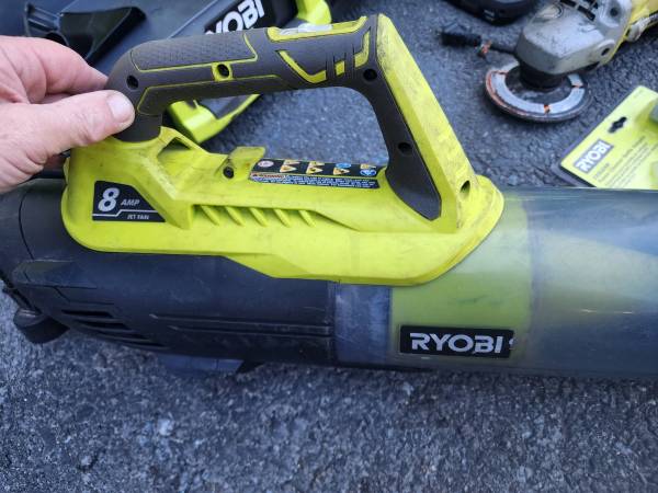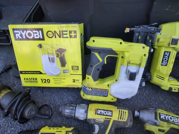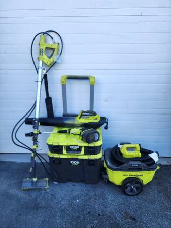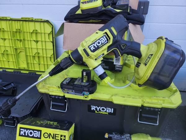 2 Drill drivers, 2 impact drivers, Cordless Compact 3/8 in. Right Angle Drill, Cordless Oscillating Multi-Tool, Cordless High Pressure Inflator, Brushless Cordless AirStrike Brad Nailer, Wet Dry Vacuum, EZClean 600 PSI 0.7 GPM Cordless Electric Power Washer, 135 MPH 440 CFM 8 Amp Corded Electric Jet Fan Leaf Blower, (2)18V Cordless Handheld Sprayer (One New), Corded 4-1/2 in. Angle Grinder, Power washer brush attachment, 2 battery chargers, 1 good battery, 22.2 in. LINK Rolling Tool Box with LINK Medium Tool Box.