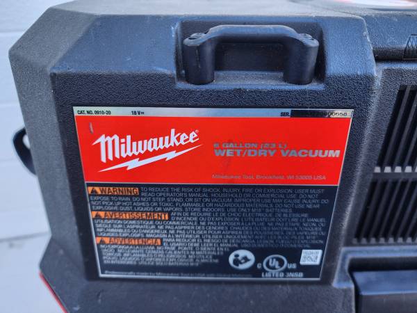 Milwaukee 0910-20 M18 18 Volt FUEL 6 Gallon Wet/Dry Vacuum, with Hose, and Accessories. In good working condition, the Battery is not included. Check my other listings, I have several Vacuums...