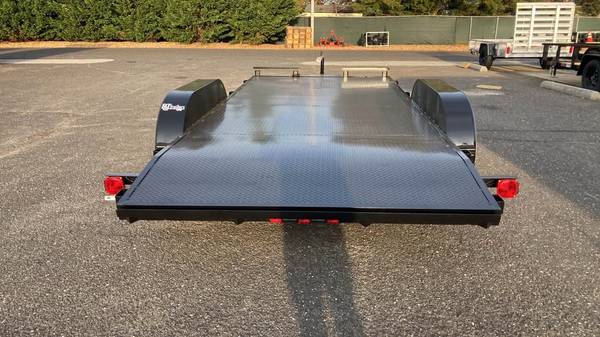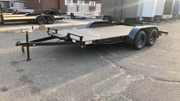Brand new 16’ steel deck car hauler Tandem axle Electric brakes 2” coupler Rear ramps stored under trailer 7k gvwr 5k capacity Winch mount standard 7pin wire harness 82” between fenders Ready to work