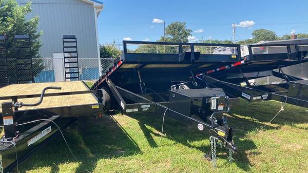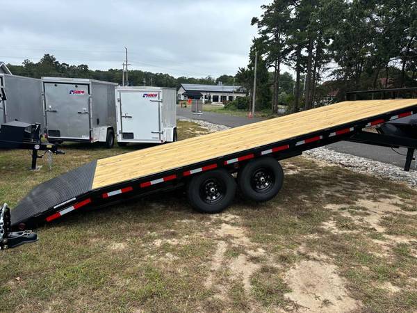 24’ deckover tilt trailer Tandem axle Electric brakes Pressure treated wood deck Adjustable 2 5/16 coupler Powder coated finish 14k gvwr 10620 capacity Stake pockets Power up and down gravity down...