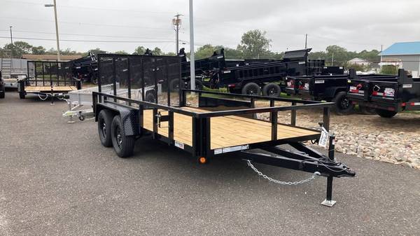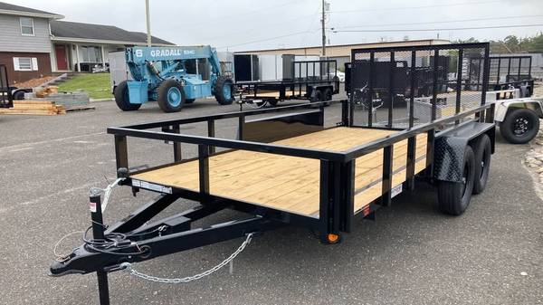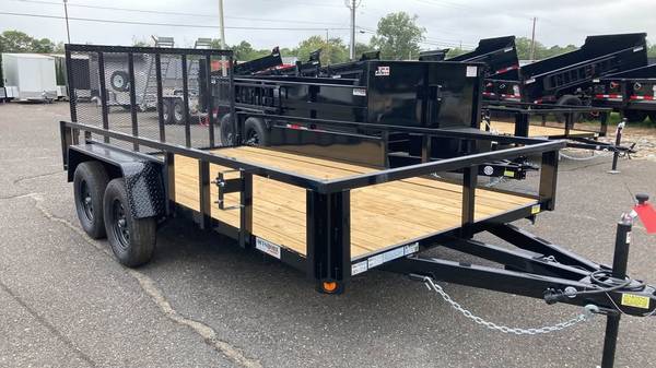 Brand new 16’ utility trailer Tandem axle Electric brakes Pressure treated wood deck 2 5/16 coupler Powder coated finish 7k gvwr 5k capacity Rear ramp gate Gate folds down Into bed Ready to work