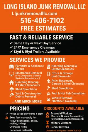 Long Island junk removal, LLC Free estimates Residential / Commercial / Industrial Same day service if not next! Suffolk County, Nassau County, Suffolk, Nassau, Long Island, LI, Riverhead, Stony...