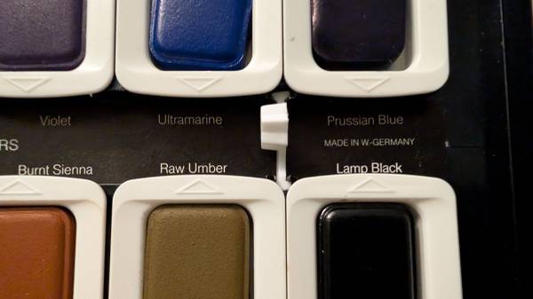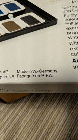 Brand New, high end watercolor set Made in Germany Comes in original box 12 Colors Yellow Blue green Vermilion Yellow green Carmine Yellow ochre Violet Burnt sienna Ultra marine Raw umber Prussian...