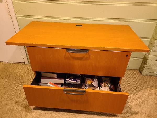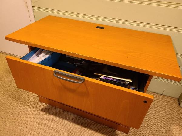 1 under desk filing cabinet drawer with 2 short deep drawers and one extra deep filing cabinet drawer for hanging files or storage: 17 inches long x 23 inches deep x 26 inches high