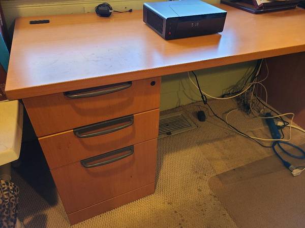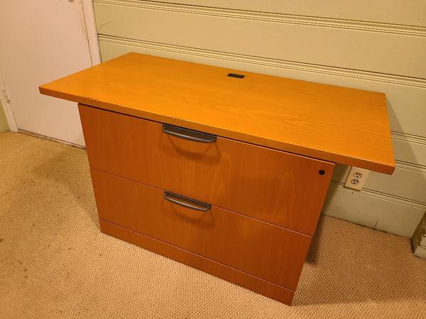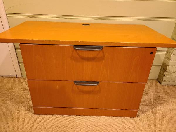 The under-desk filing cabinet drawers match exactly with the executive desk and were purchased together at the same time from the same company. The filing cabinet drawers were never screwed to the desk because the cabinets fit perfectly snug under the table.