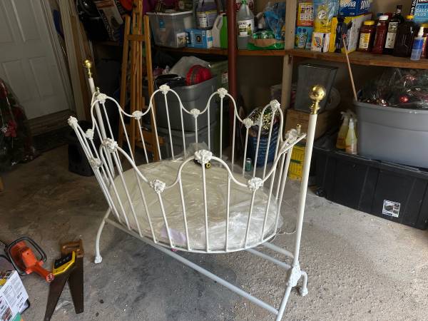 White over wrought iron rocking crib. All mattresses and safety pads in excellent condition. Price is negotiable. Can deliver locally
