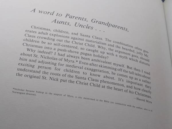 Emphasizes the biblical accounts of the events surrounding the birth of Jesus while providing children with an understanding of the origins of Santa Claus.