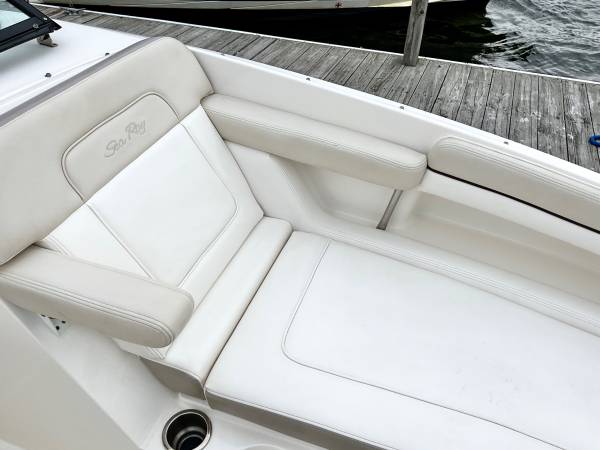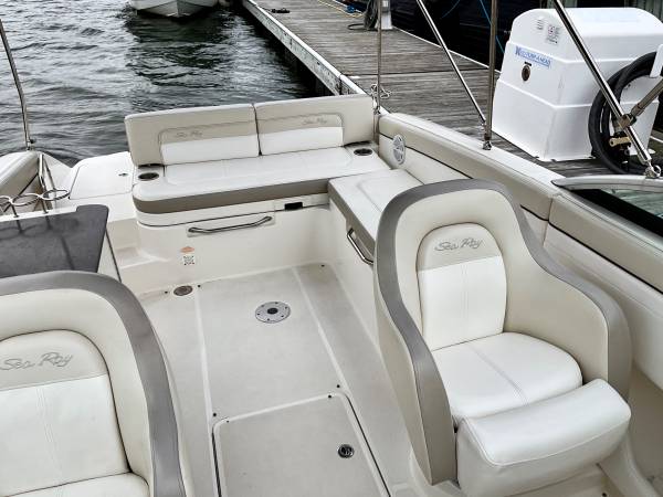 Purpose-driven engineering is a Sea Ray hallmark. Our 280 Sundeck features adjustable "sun gate" transom seating for enhanced utility, distinctive helm visors to minimize glare on the gauges and slip-resistant swim platform inserts for better footing.