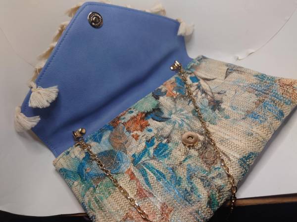 Urban Expressions Lilian Floral Clutch Floral Print Fold Over Envelope Shape Tassel Trim Vegan Leather Fabric Lined Interior with Slip Pocket and Zippered Pocket Long 21" Gold Colored Shoulder Chain...