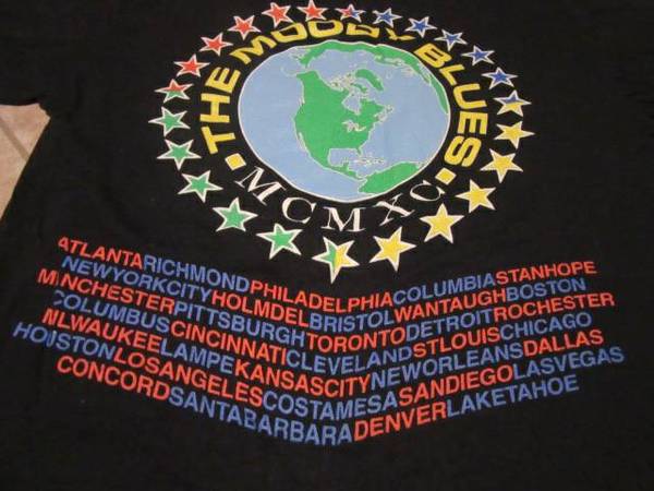 The Moody Blues 1990 tour black t shirt. This is an official original i bought when they played at the Jones beach theater August 4th 1990. No holes, no stitch issues. Colors are vibrant no fading in like new condition.