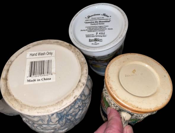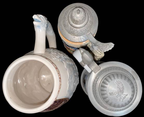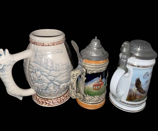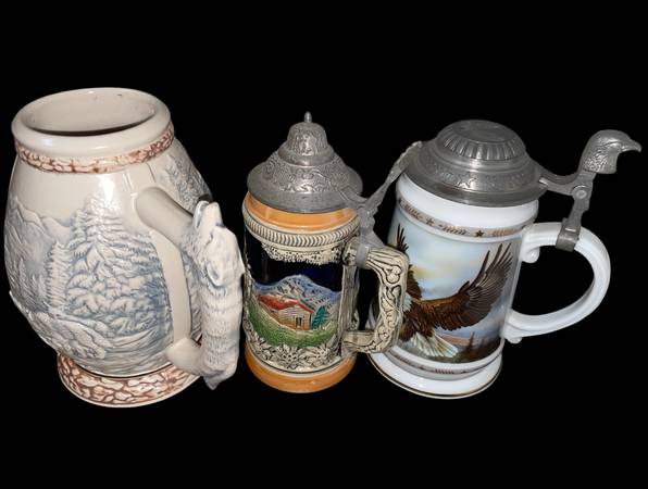 3 vintage beer steins No issues Spacious Skies lidded stein limited edition 7 x 4" Ceramic painted wolf handled stein 7 x 4 1/2" German lidded stein 7 3/8 x 3 1/4"