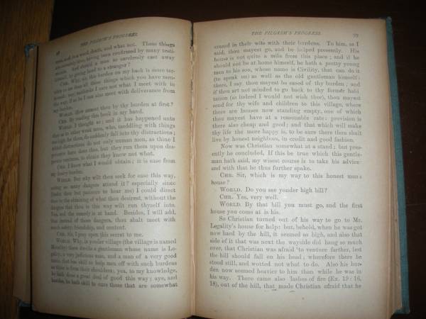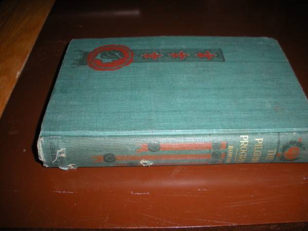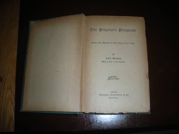 1ST EDITION of Pilgrim's Progress, hardcover, "The Pilgrim's Progress From This World to that Which is to Come" by John Bunyan, with a Life of the Author. Published, Printed and Bound by Donohue; Henneberry in Chicago. Includes "The Life of John Bunyan". 422 pages on flat/inexpensive paper. Pages are browned. Only one loose page (title page). Clean copy (other than owner's signature/date --one owner wrote their name/date on first page--before the title page)--which is dated Oct. 25, 1899. Cover is dark green and has 3 small holes on the spine. Cover shows some wear, but very reasonable for its age. Offers considered. S and H extra.