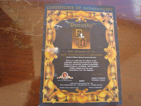 If The Ad is Still posted, The item is STILL available. Disney/MGM - Dorothy-Wizard of Oz -jack in the box - 50th Anniversary see photos Dorothy In the Box, with VHS, & Certificate of...