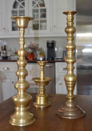 Vintage Solid Brass Candlesticks; very good condition; very heavy; 10" high with 4" base; 17.5" high with 4.5" base; 19.5" high with 6" base; $75.00 for all 3; Local pickup and serious cash buyers...