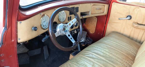 This is a 1954 International Harvester with custom work. It has a Chevy 350 motor and transmission. It sits on a Chevy S-10 frame as well. It has shaved handles, vintage heat and A/C, Dolphin White-face gauges, ostrich interior, custom exhaust and body work. The truck runs and drives. It currently has a fuel issue. It starts and shuts off when not given gas. It also needs a radio and cosmetic work (as seen in the pics).