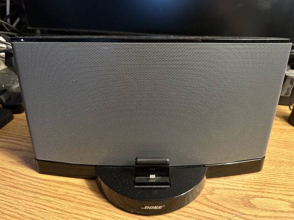 Bose SoundDock Series III Digital Music System, it directly works/charges with iPhone 5 to iPhone 14 models. It comes with a long 10-power supply. It also has Auxiliary input that lets you plug in a Bluetooth adapter or play an additional sound device, such as a portable DVD, CD, or other MP3 player. This item produces excellent quality music.