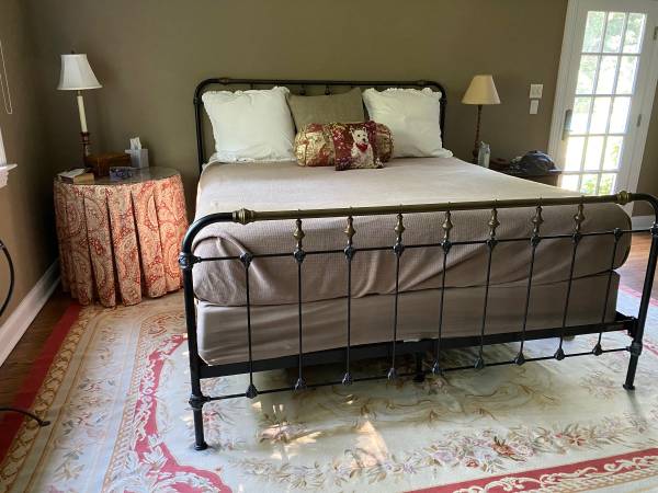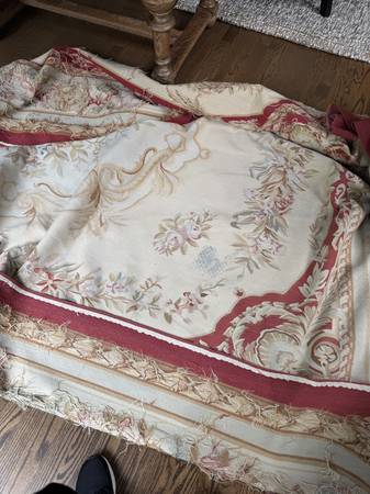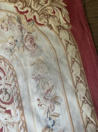 Lovely wool Aubusson Rug 9 x 12. Fair condition - has some wear where iron bed legs were, some fading from late day sunshine on one area. Colors predominantly brick/barn red and beiges. Purchased...