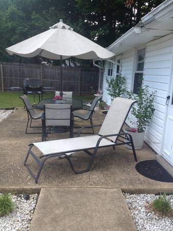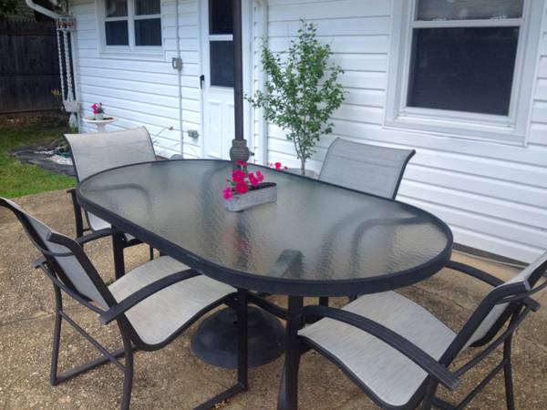 ONLY ITEMS LEFT - BEAUTIFUL BACKYARD FURNITURE OVAL GLASS TABLE WITH 4 CHAIR FOR SALE, PERSONALLY CUSTOMED ORDERED MYSELF, BROWNISH COLOR NOT SURE WITH WHITE/BROWNISH MATERIAL - GREAT CONDITION -...