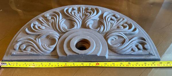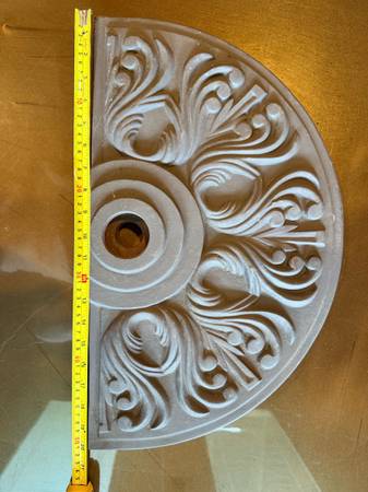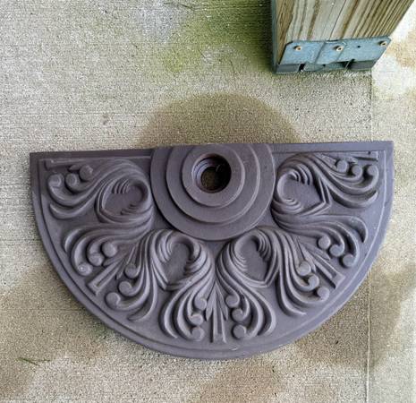 Decorative Cast iron half-moon brown/antique bronze base for a patio umbrella. Great for placing near the straight edge of a deck or patio! Powder-coated finish making it rust resistant.