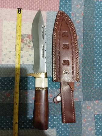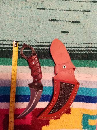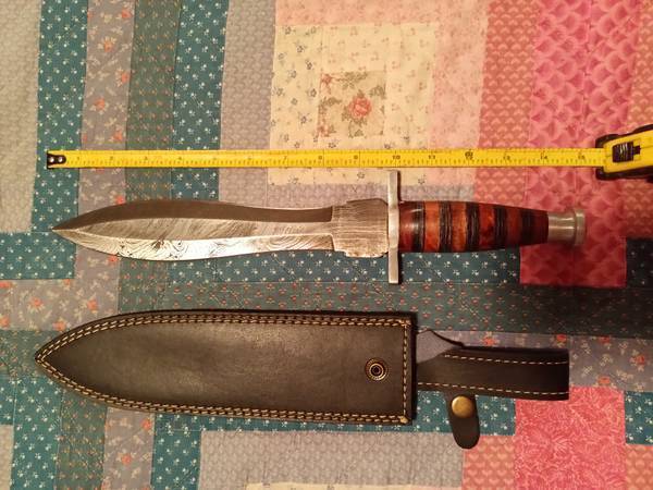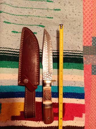 ALL KNIVES ARE NEW AND NEVER USED: 1) Damascus Skinner/Rare...8" overall/4" handle/4" blade...hardwood handle/bolster...asking $30.00 2) D2 Steel Hunting Blade...12" overall/5" handle/7"...