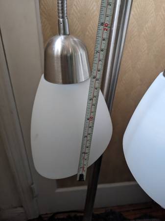 Silver finish. White plastic shades. 5 arms adjust to any angle. 3 way switch turns on 2 bulbs, 3 and 5 bulbs. Uses standard 60 watt bulbs.