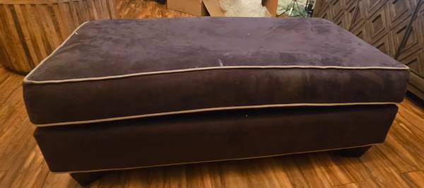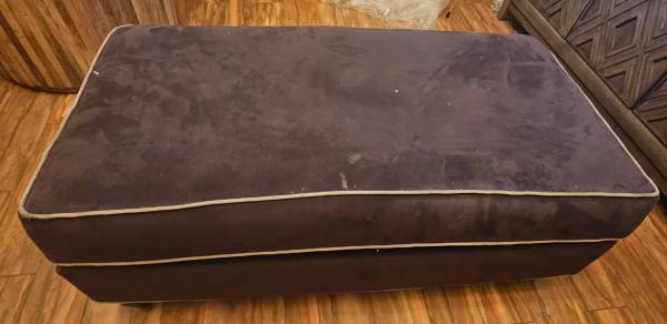 Great piece to use for additional seating when entertaining, as a leg rest or as a coffee table if you place a tray or two. Wooden legs. Grab it while you can! 26in length 48in width 16in height