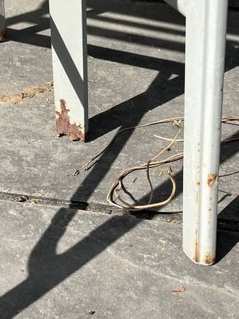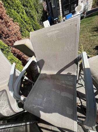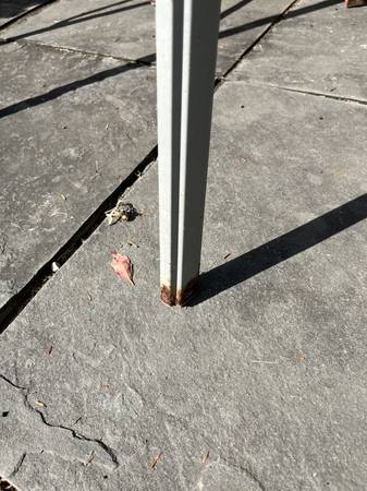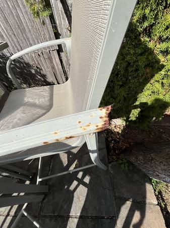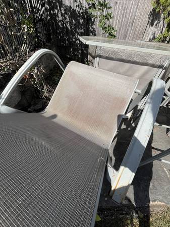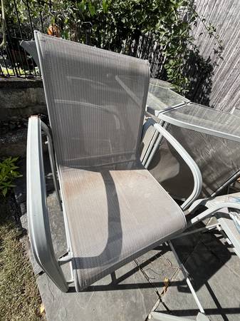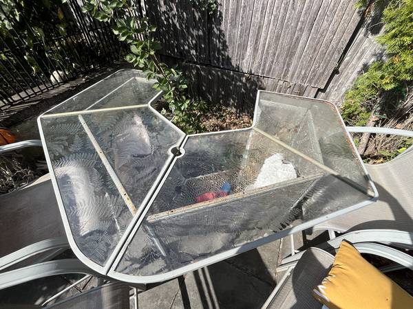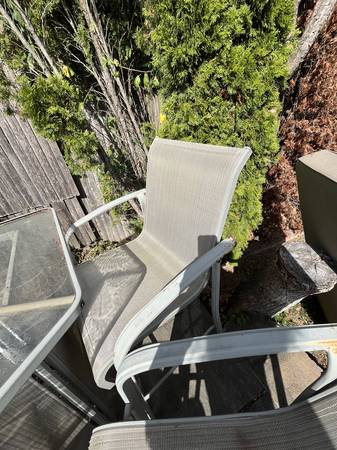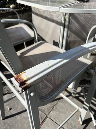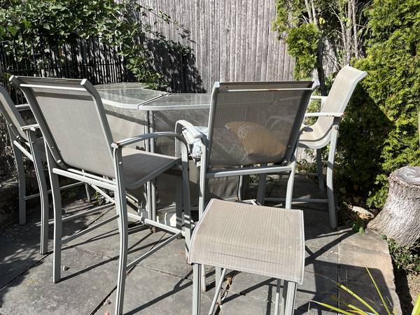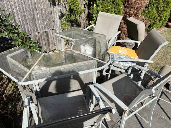 This bar still has a lot of life left in it. It is very solid and has a hole in the glass top for an umbrella. There are definitely wear and tear and rust mark and all have been photographed honestly. The chairs have been washed but have some rust stains that I usually cover with pillows. They are super comfortable for sitting all evening. This was originally a $1,800 set. Seeking $100.