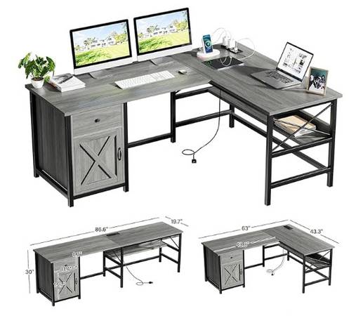 2-in-1 Convertible Desktop: This l shaped desk with drawers can be transformed into a spacious double desk measuring 86.6" W x 19.7" D according to your needs. The desktop is wide enough to hold 2 desktop computers and 1 laptop, allowing 2 people to work, study or play games simultaneously, without feeling cramped. Moreover, the large l shaped desk with drawers’ desktop is equipped with 2 AC sockets and 2 USB ports for convenient charging four devices at the same time.