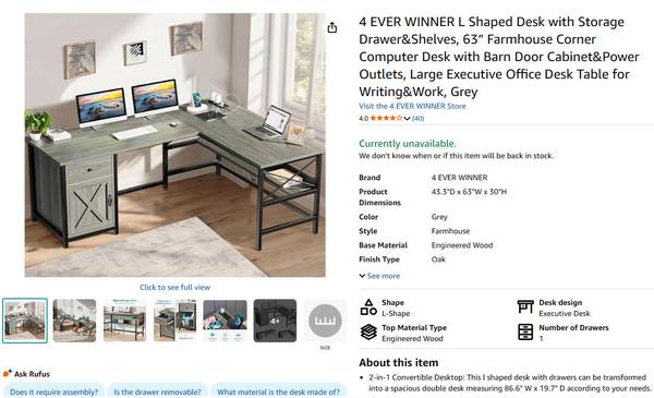 Farmhouse style: This corner desk with storage features farmhouse style, looks simple but practical. L-shaped design is suitable to place it in the corner as a corner desk, is a good choice for home or office. Dimensions of it is 43.3" D x 63" W x 30" H.