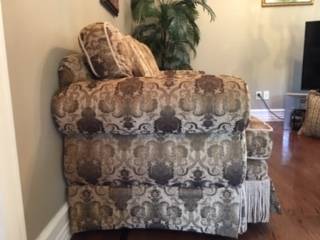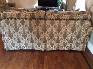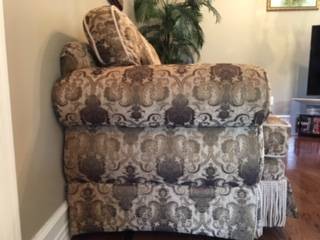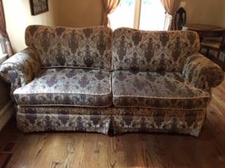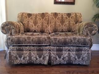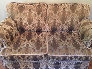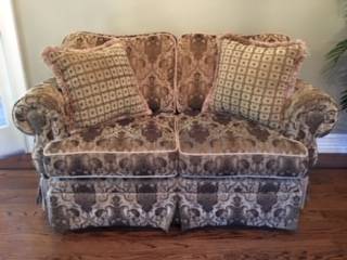 Lovely sofa and love seat set purchased five years ago. This set is in VERY GOOD condition. Soft gold and rich brown in color with an elegant design on the fabric. Rope trim on all cushions and fringe trim on the bottom corners of each piece. Sofa is large and can fit approximately 4-5 people. Love seat fits 3 people. Sofa's back cushions were recently restuffed and both pieces were cleaned. Cushions are very comfortable. There is some minor wear on the seat cushions on the large sofa only - however, cushions can be flipped. Otherwise, the set is in excellent condition! All four pillows are INCLUDED!