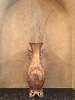 This sleek and stylish vase is an eye-catcher. It's a shimmering gold color with soft bronze coloring on the decorative design of the vase. There are no scratches nor marks - NO flaws!