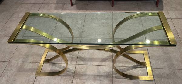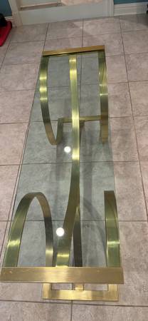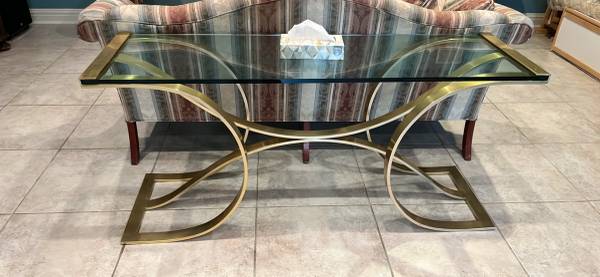 Gold frame console sofa table with glass top. Pre-owned, sturdy, heavy table in good condition, minor chip. See pictures. Approximate dimensions: 60x18x27.