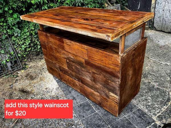 Suitable for against wall , but if seeing back and need a rear seating overhang I can wainscot the back and add a deeper top (27 x 60) for an additional $20. This particular configuration will also allow seating overhang in front