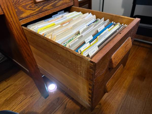 Tower drawers extend back 26 inches and are 13 1/2 inches wide. Lower right includes space for hanging files. There are also two pullouts. One on each side.