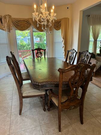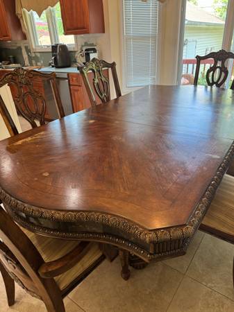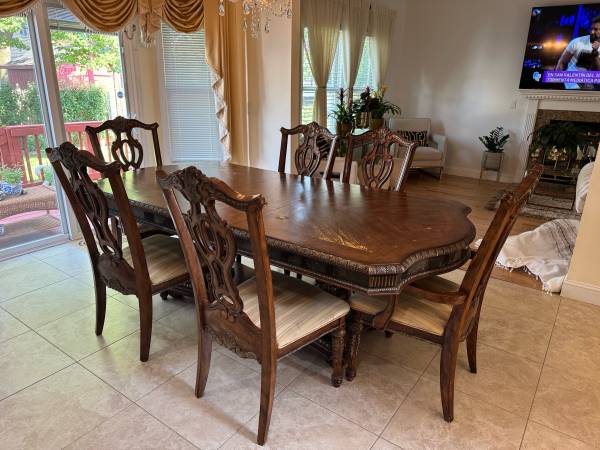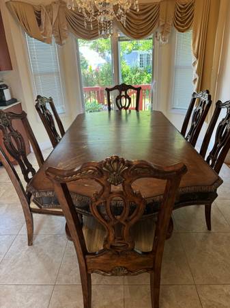 90” X 46” table top/ 30.5” high. Minor marks on table surface as shown in pictures. 6 chairs as shown in pictures in great condition. Asking: $500/OBO **cash only upon pick up**