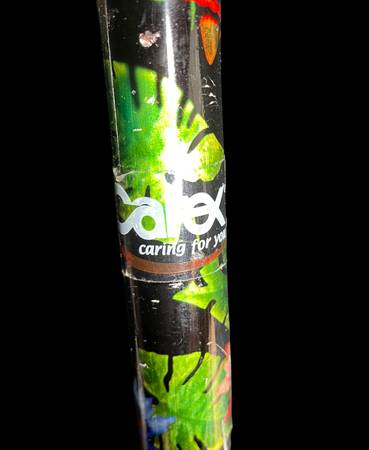 Tropical graphic painted on not shrink wrap Doesn't say weight capacity but probably for someone between 250 and 300lb Lightly used