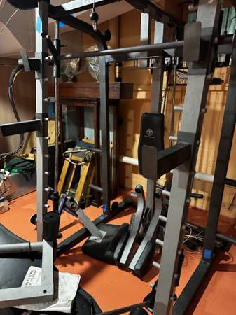 Used gold’s gym smith press machine as is. Missing some parts and bolts. Can easily be purchased or replaced. No weights included