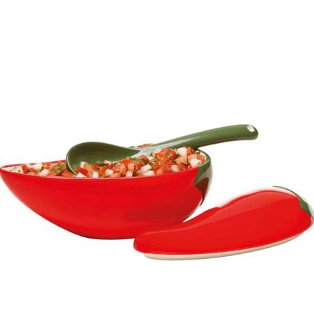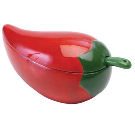 • Features a red and green chili pepper design, often hand-painted, and includes a matching spoon.