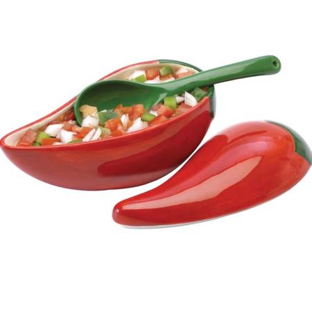 Ceramic chili pepper-shaped serving bowl set, ideal for salsa, dips, or other condiments.