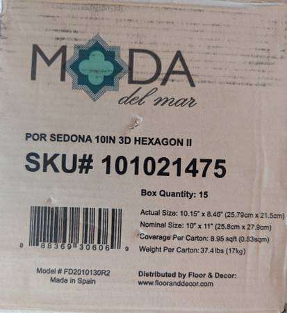 5 unopened boxes of 15. One opened box of 11. Each box covers 8.95sqft, individual pieces are 10"x11" $65 per box $45 for the opened box