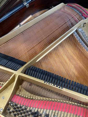Steinway M, 277214, was rebuilt in the 80's best I can tell. This piano needs a pinblock or in the least oversize tuning pins, restringing and possibly a new set of Steinway hammers. The action was redone with non Steinway parts but plays and sounds good just won't stay in tune. Soundboard is in great shape with a tiny crack in the high treble end as seen in the picture. Bridges are perfect with no cracks. All of the agraffes are in like new condition with none broken. Finish appears to be original and the case is solid with all factory parts in tact.