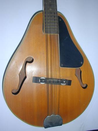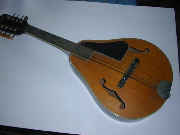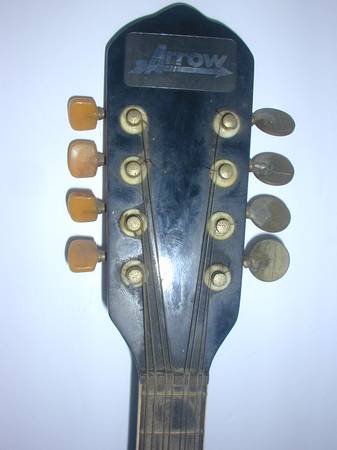 The maker of this mandolin is Arrow. It features an adjustable bridge and a pick guard. I would rate it as being in very good to excellent condition, with very little wear. (See photos, including the creative welding done to repair the tuners). Dimensions are 27"H x 11"W x 3"D.