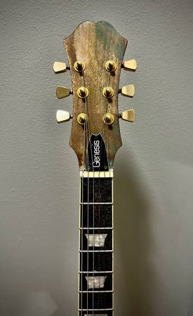 This guitar needs some explanation about its appearance: I did not perform the refinish on this 2013 Epiphone Genesis Deluxe Pro Limited Edition Custom Shop guitar so much of my description will be diagnosed after the fact. I got the wooden husk of this guitar used in this modified state without any parts included. I do not know what the original finish was as the top, back and headstock had been sanded to the wood and had an extremely light coat of green spraypaint under a clearcoat (some of which is still visible in places). The neck, the sides of the body, the fretboard, the binding, and the back of the headstock have been left alone and the guitar still feels and plays as it should. The control panel area was shielded and routed out (likely for some sort of custom or proprietary electronics layout.