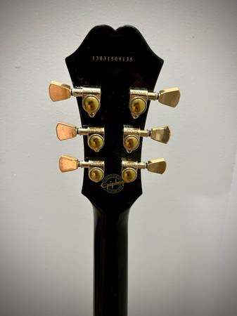 As for the tuners, I installed some neat looking gold Grovers. They are not the same shape the guitar would have originally came with but it looks cooler this way if you ask me. It has a chrome Epiphone tune-o-matic bridge layout. I didn’t have a suitable gold set to match what the instrument would have originally had in my shop so I went with chrome. The strap pins are Gibson so there’s an easy upgrade.