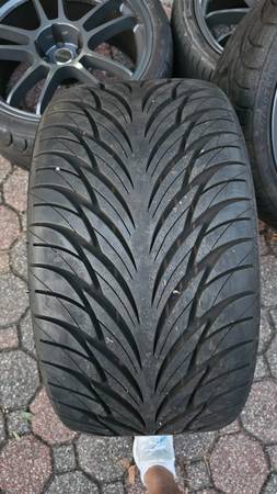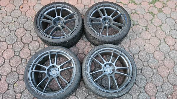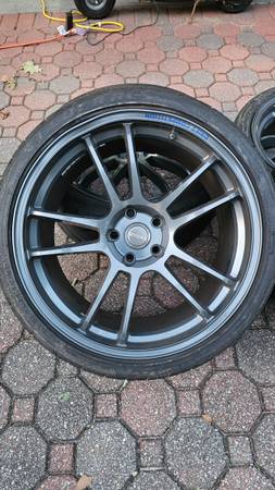 Staggered set of 19" Tenzo R DC5 wheels (9.5" Fr/10.5" Rr) in Gunmetal Gray powder coated finish and 5 x 114.3mm bolt pattern. They were previously mounted on a 1996 Nissan 300ZX TT. Wheels are in fair condition overall, with two wheels in particular (1 Fr + 1 Rr) marred by noticeable dents in the lips. The other two are true but have minor curb rash. Despite the damage, they hold air and don't leak. I haven't checked, but I'm sure the wheels can be repaired to look like new. Included tires are all full set of Federal SS595 Ultra High Performance Z-rated summer tires. Tires sizes are 245/35/ZR19 Fr and 275/30/ZR19 Rr. Tires are like new and have near full tread depth. The tires alone are worth the price!