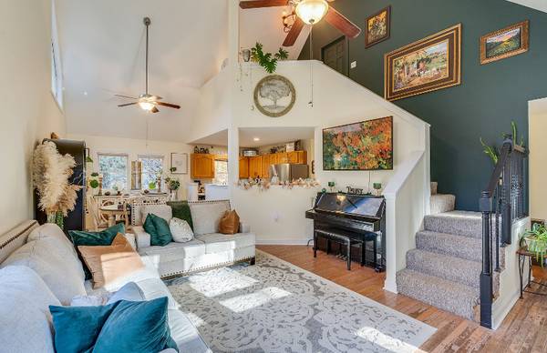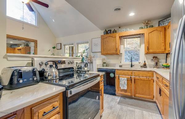 This home features approximately 1,700 square feet of finished living space with cathedral ceilings and an open floor plan. The full walk-out basement adds roughly 780 additional square feet of unfinished space, perfect for a workshop, studio, or future guest suite. The home includes remodeled bathrooms, fresh interior and exterior paint, and new kitchen countertops with updated fixtures. Enjoy outdoor living from two spacious decks—both overlooking the creeks. One deck is connected to a bedroom and another at the front of the home to take in the sunrise.