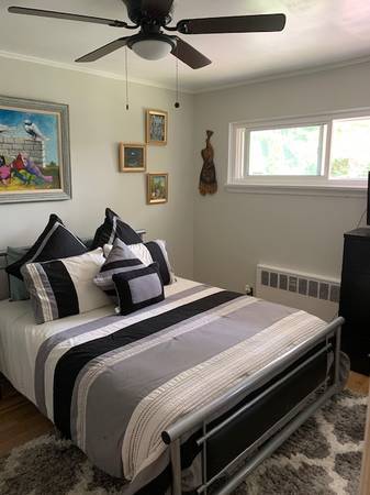 The room has a queen-size bed w/ mattress, two end tables, two table lamps, one dresser, one mini fridge and one small microwave. A large closet in the room along with a ceiling fan and a large window overlooking the yard.
