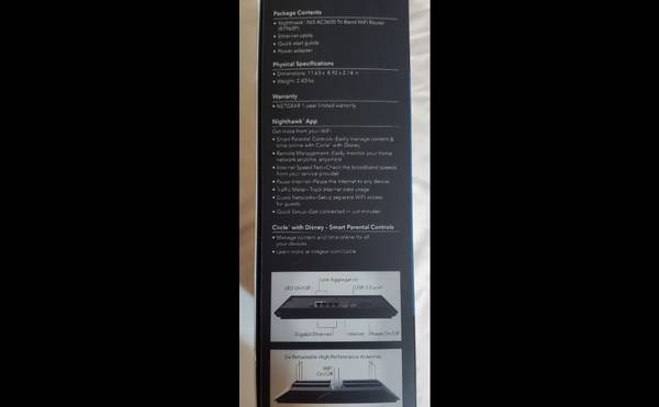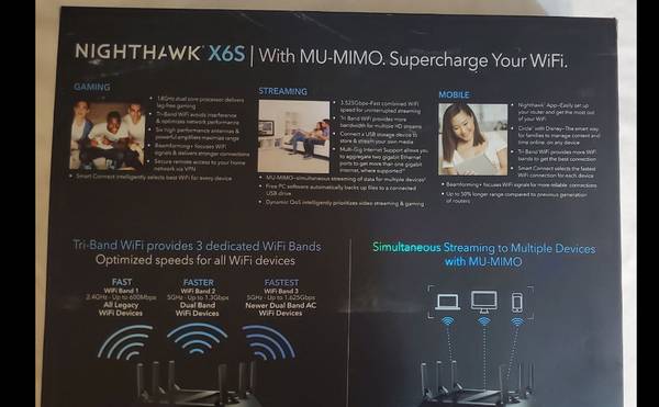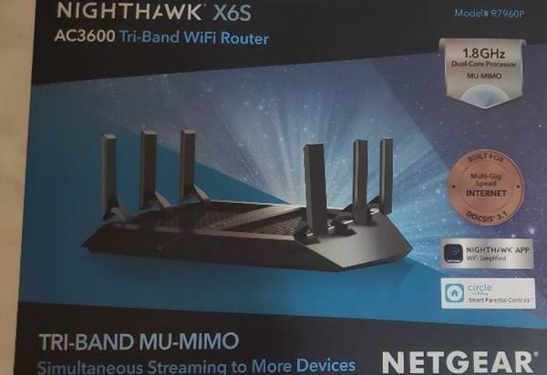 never used Nighthawk® X6S Tri-Band WiFi Router (up to 3.525Gbps) with NETGEAR Armor™, Circle® Smart Parental Controls, MU-MIMO Get blazing-fast combined WiFi speeds up to 3.525Gbps, MU-MIMO, and 1.8GHz dual-core processor for extended range for ultra-smooth streaming, online gaming, and more. With NETGEAR Armor™ providing advanced cyber threat protection for your home and your connected devices and Circle® Smart Parental Controls to easily manage content. WiFi Technology : Wi-Fi 5 (802.11ac) Tri-band Gigabit WiFi Performance : AC3600 (600Mbps @2.4GHz+ 1300Mbps@5GHz +1625Mbps @5GHz)† WiFi Range : Very large homes WiFi Band : Simultaneous tri-band Beamforming : Beamforming+—Smart, signal-focusing technology boosts the speed, reliability, and range of your WiFi connections Number of Ethernet Ports : Five (5) 10/100/1000Mbps—(1 WAN & 4 LAN) Gigabit Ethernet ports Number of USB Ports : One (1) USB 3.0 port