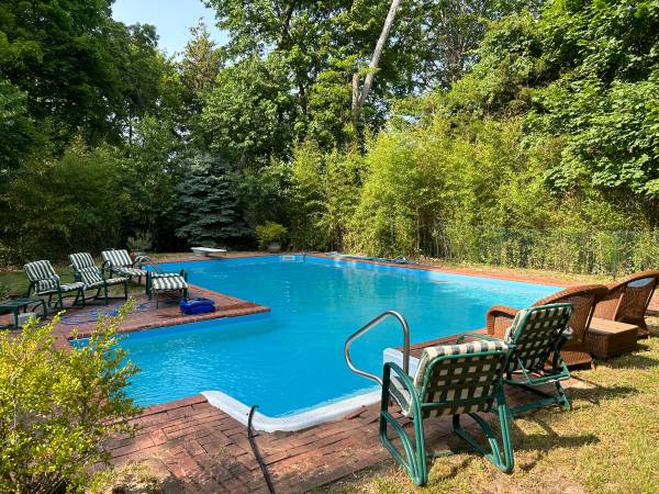The 30'+ x 40'+ L-shaped pool has a 10-foot deep end, diving board, and water slide (covered for winter).